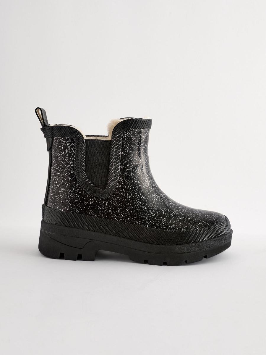 An insulated, glittered rubber boot with a chunky, rugged sole, a Chelsea silhouette, and cozy faux-fur lining.