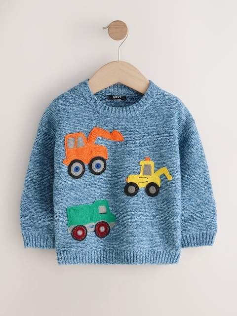 A fun and warm marl knit jumper featuring playful construction vehicle appliqués, perfect for little explorers.