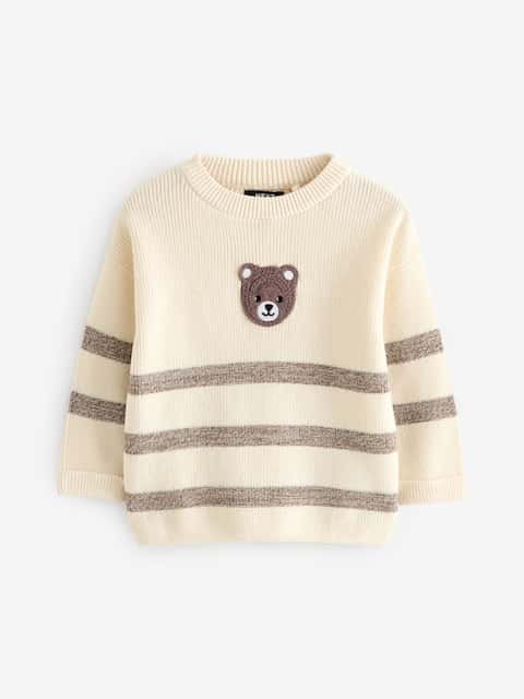 A textured rib-knit jumper featuring contrasting horizontal stripes and a charming dimensional bear character appliqué.