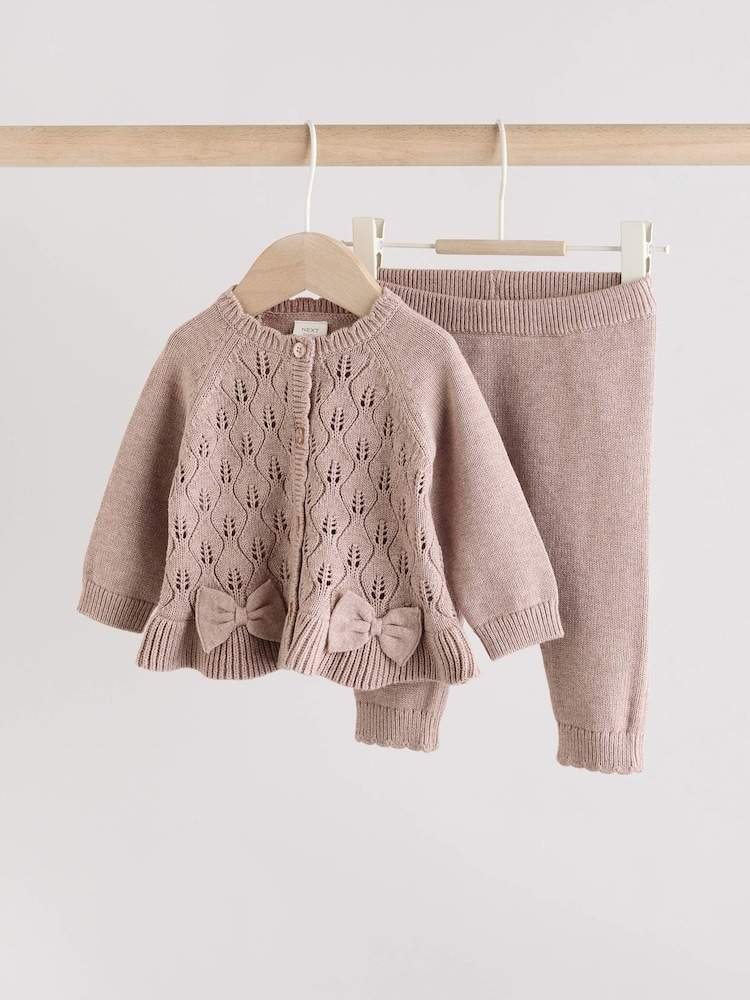 Wrap your little one in cozy comfort with this beautiful knitted cardigan set. Made from pure cotton with a wonderfully soft knit texture, this two-piece ensemble is perfect for keeping them snug and stylish. The set includes a button-down cardigan with charming bow detailing and coordinating leggings with ribbed hems, ensuring a perfect fit.