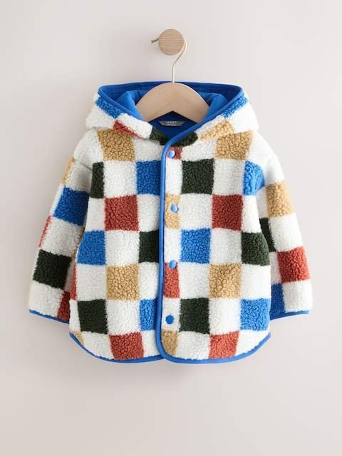 Add a splash of fun and color to their wardrobe with this incredibly cozy sherpa fleece jacket. Featuring a bold and playful checkerboard pattern, this jacket is designed to stand out. The ultra-soft, high-pile fleece provides exceptional warmth and a wonderfully tactile feel, making it perfect for chilly days. An integrated hood adds extra snugness, while the easy snap-button front makes dressing a breeze. A vibrant, contrasting trim along the edges and a smooth-lined hood complete the charming look.