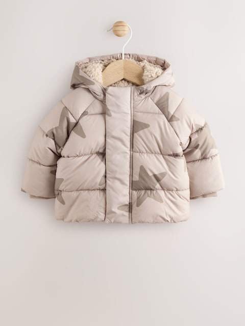 Let your little star shine even on the coldest days with this fashionable and cozy puffer jacket. Featuring a playful all-over star print, this padded coat is designed to keep your baby wonderfully warm and protected. The attached hood has a super-soft sherpa fleece lining for extra snugness and warmth. For practical protection against chilly breezes, the jacket includes a full zip-front with a storm flap and comfortable ribbed cuffs that lock in heat. It’s a perfect blend of celestial style and essential winter warmth.