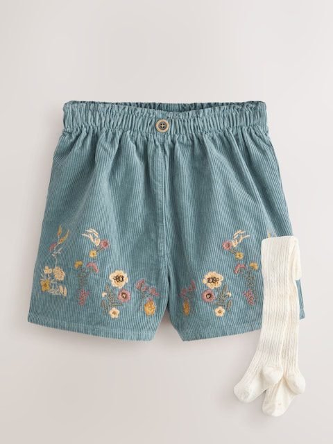 A charming two-piece set featuring embroidered corduroy shorts with an elasticated waist and coordinating warm, textured cable knit tights for cozy autumn style.