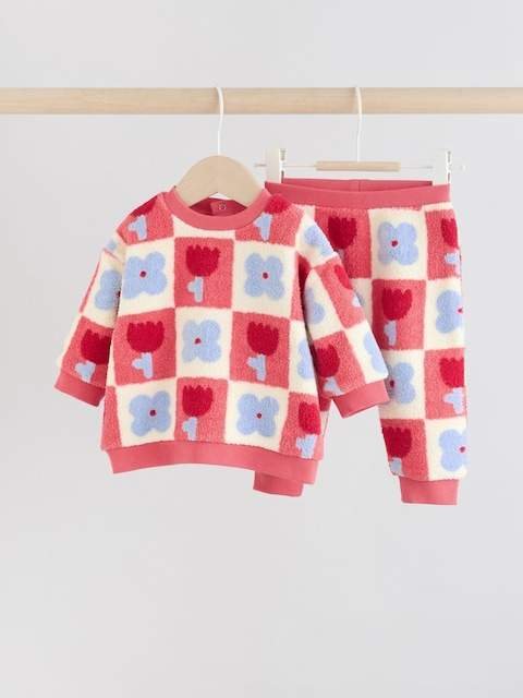 - Features: A plush, fuzzy texture with an all-over checkerboard and floral pattern. The top has a buttoned crew neck and the trousers have an elasticated waist and cuffs.